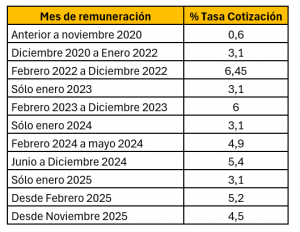 De acuerdo con la Ley N° 21.722, que aprobó el Presupuesto del Sector Público para el año 2025 e instrucciones de la Superintendencia de Seguridad Social mediante circular N°3889 del 5 de noviembre 2025, se introdujo una modificación en la distribución de la tasa de cotización del 7% para salud de los trabajadores afiliados a FONASA y que se encuentren adscritos a una Caja de Compensación. En efecto, a partir del proceso de declaración y pago de las cotizaciones correspondientes a las remuneraciones pagadas en el mes de noviembre de 2025, el que debe realizarse en el mes de diciembre, la distribución del 7% obligatorio para salud será de un 2,5% de cotización para FONASA y de un 4,5% de cotización para la Caja de Compensación de que se trate.